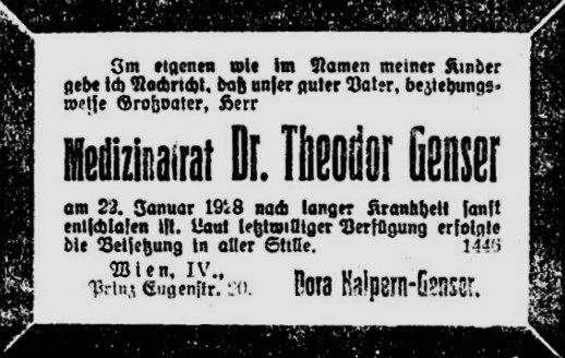 Todesanzeige: Genser Theodor, Neue Freie Presse, 25.1.1928, S. 15.