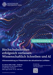 In der Veranstaltung können Studierende und Betreuer:innen von MedUni Wien Hochschulschriften erfahren, wie Abschlussarbeiten konform der definierten Standards und Formvorschriften und des Leitfadens für das Erstellen von Hochschulschriften zu erstellen sind.